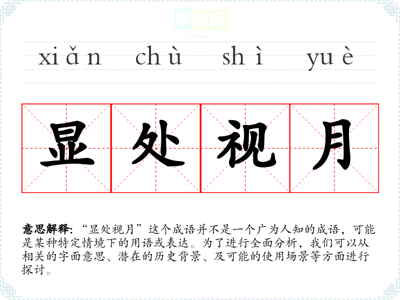 “显处视月”这个成语并不是一个广为人知的成语,可能是某种特定情境下的用语或表达。为了进行全面分析,我们可以从相关的字面意思、潜在的历史背景、及可能的使用场景等方面进行探讨。