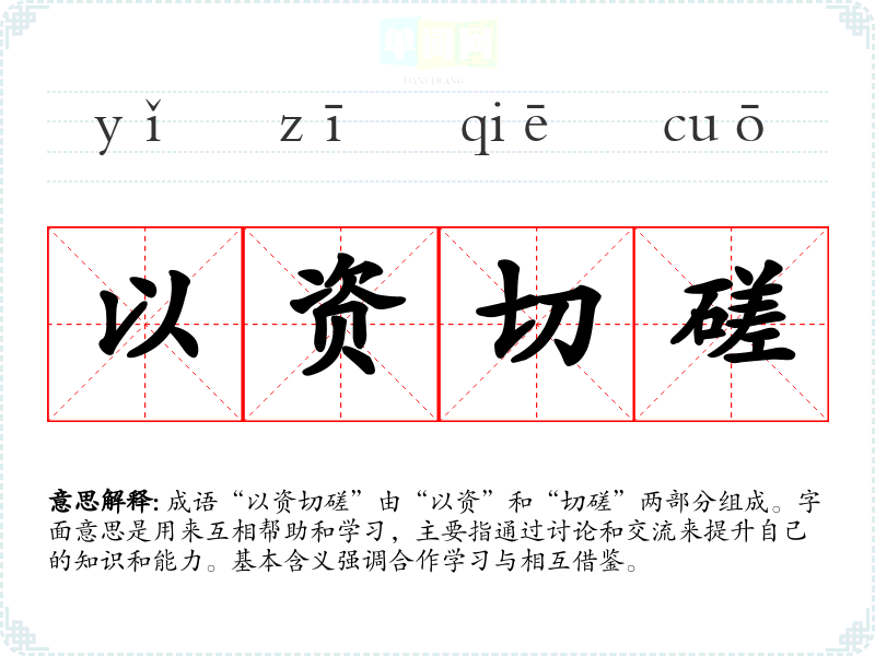 成语“以资切磋”由“以资”和“切磋”两部分组成。字面意思是用来互相帮助和学,主要指通过讨论和交流来提升自己的知识和能力。基本含义强调合作学与相互借鉴。