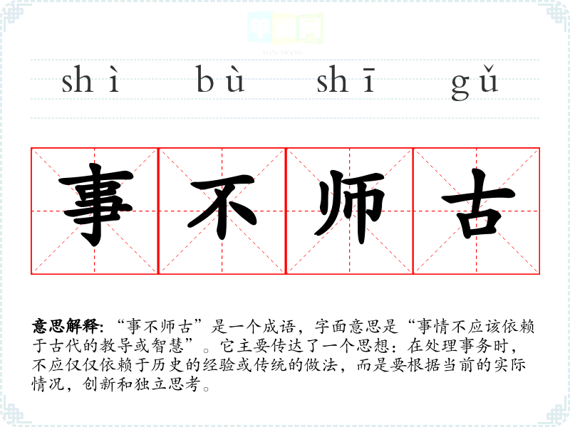“事不师古”是一个成语,字面意思是“事情不应该依赖于古代的教导或智慧”。它主要传达了一个思想:在处理事务时,不应仅仅依赖于历史的经验或传统的做法,而是要根据当前的实际情况,创新和独立思考。