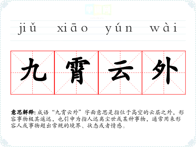 成语“九霄云外”字面意思是指位于高空的云层之外,形容事物极其遥远,也引申为指人远离尘世或某种事物,通常用来形容人或事物超出常规的境界、状态或者情感。