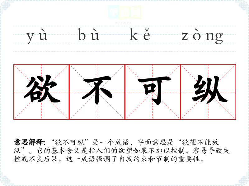 | 欲不可纵 | 欲:欲望;纵:放纵。欲望不可以放纵。 |