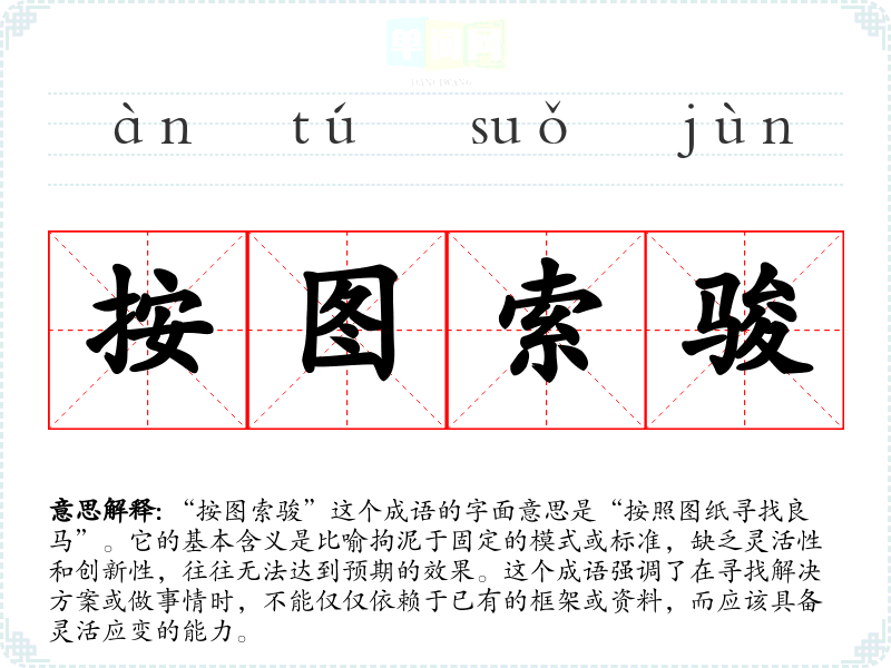 “按图索骏”这个成语的字面意思是“按照图纸寻找良马”。它的基本含义是比喻拘泥于固定的模式或标准,缺乏灵活性和创新性,往往无法达到预期的效果。这个成语强调了在寻找解决方案或做事情时,不能仅仅依赖于已有的框架或资料,而应该具备灵活应变的能力。