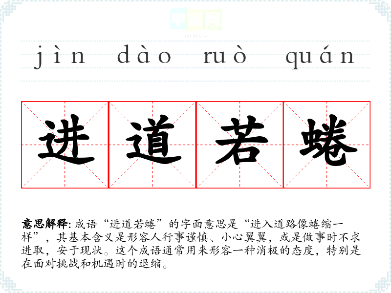 成语“进道若蜷”的字面意思是“进入道路像蜷缩一样”,其基本含义是形容人行事谨慎、小心翼翼,或是做事时不求进取,安于现状。这个成语通常用来形容一种消极的态度,特别是在面对挑战和机遇时的退缩。