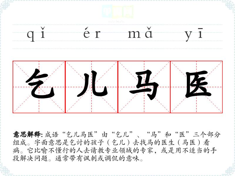 成语“乞儿马医”由“乞儿”、“马”和“医”三个部分组成。字面意思是乞讨的孩子(乞儿)去找马的医生(马医)看病。它比喻不懂行的人去请教专业领域的专家,或是用不适当的手段解决问题。通常带有讽刺或调侃的意味。