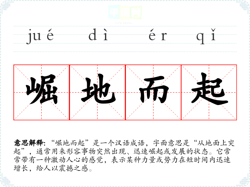“崛地而起”是一个汉语成语,字面意思是“从地面上突起”,通常用来形容事物突然出现、迅速崛起或发展的状态。它常常带有一种激动人心的感觉,表示某种力量或势力在短时间内迅速增长,给人以震撼之感。