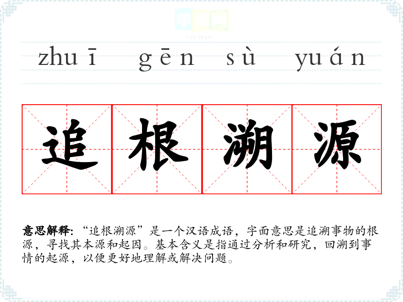 “追根溯源”是一个汉语成语,字面意思是追溯事物的根源,寻找其本源和起因。基本含义是指通过分析和研究,回溯到事情的起源,以便更好地理解或解决问题。