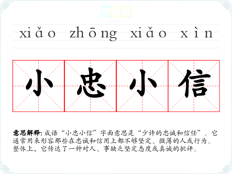成语“小忠小信”字面意思是“少许的忠诚和信任”。它通常用来形容那些在忠诚和信用上都不够坚定、微*的人或行为。整体上,它传达了一种对人、事缺乏坚定态度或真诚的批评。