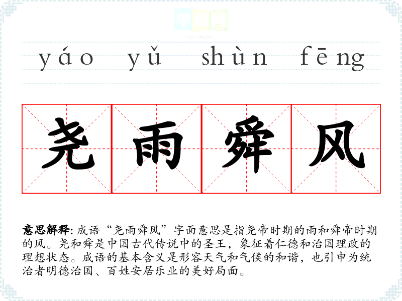 | 尧雨舜风 | 尧、舜:古代传说中的两位贤君。传说尧、舜行德政,像春风夏雨一样,沐浴着百姓,使百姓受到恩泽。比喻太平盛世。 |