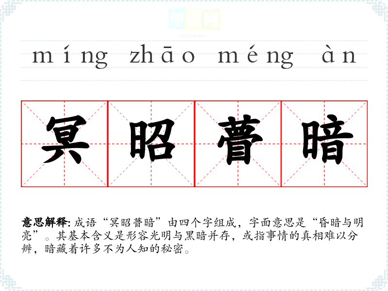 成语“冥昭瞢暗”由四个字组成,字面意思是“昏暗与明亮”。其基本含义是形容光明与黑暗并存,或指事情的真相难以分辨,暗藏着许多不为人知的秘密。