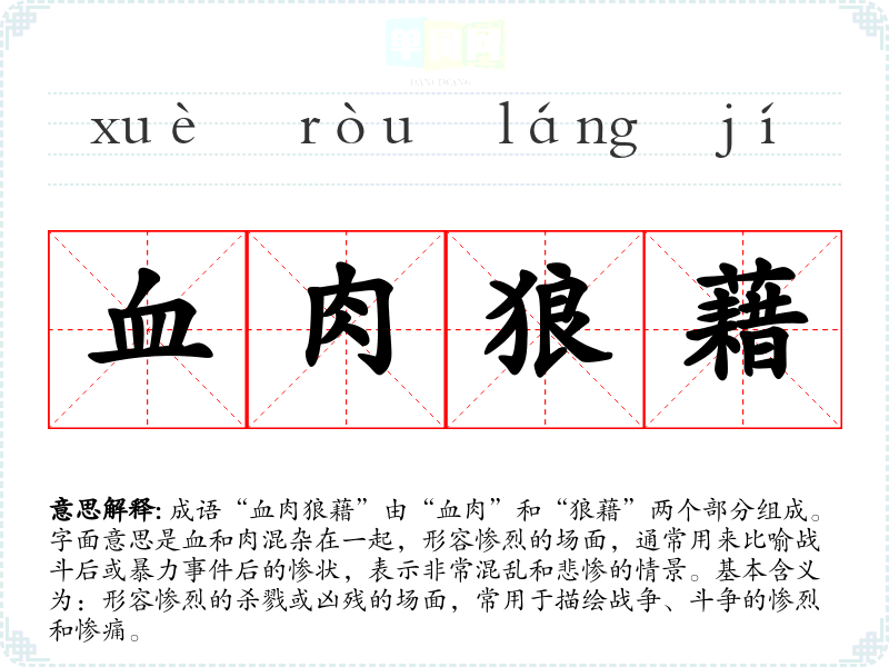 “血肉狼藉”的确切来源尚无定论,但可以追溯到**历史上关于战乱、屠杀的记载。成语中的“狼藉”一词,古时用以形容散乱、狼狈的状态,通常与血腥、暴力的场面相关。相关的历史典故可能涉及到古代战争的残酷情景,如《史记》《汉书》中关于战争后果的记载,使得这一成语在文学作品中得到了广泛的使用。