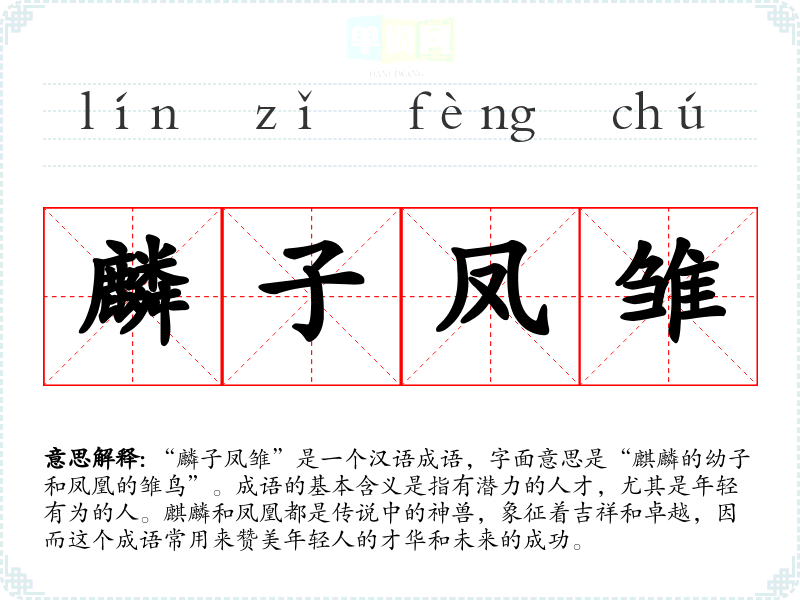 - 演讲:在关于教育或人才培养的演讲中,提到“麟子凤雏”可以强调年轻人的重要性和未来的希望。
