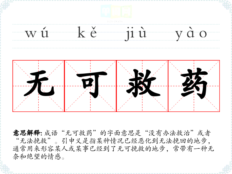 “无可救药”源于古代医术,特指病情严重到无法治疗的状态。虽然具体的历史典故不详,但可以推测这个成语与古代中医对病症的看法有关。在古代,医疗条件有限,某些疾病可能真的无药可救,因此这一说法逐渐演变为一个比喻,用于形容其他方面的绝望局面。
