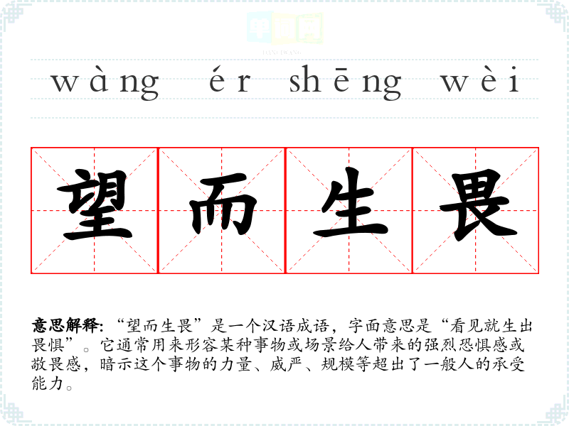 “望而生畏”是一个汉语成语,字面意思是“看见就生出畏惧”。它通常用来形容某种事物或场景给人带来的强烈恐惧感或敬畏感,暗示这个事物的力量、威严、规模等超出了一般人的承受能力。