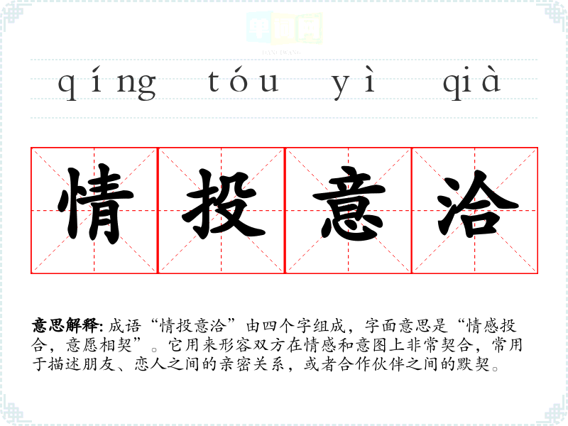 成语“情投意洽”由四个字组成,字面意思是“情感投合,意愿相契”。它用来形容双方在情感和意图上非常契合,常用于描述朋友、恋人之间的亲密关系,或者合作伙伴之间的默契。