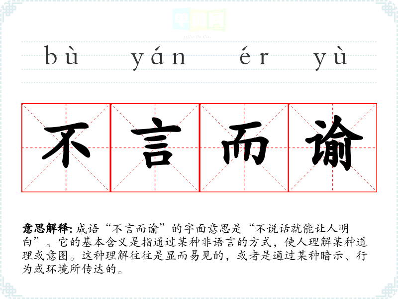 | 不言而谕 | 谕:旧时指上对下的文告、指示。不用说话就能明白。形容道理很明显。 |