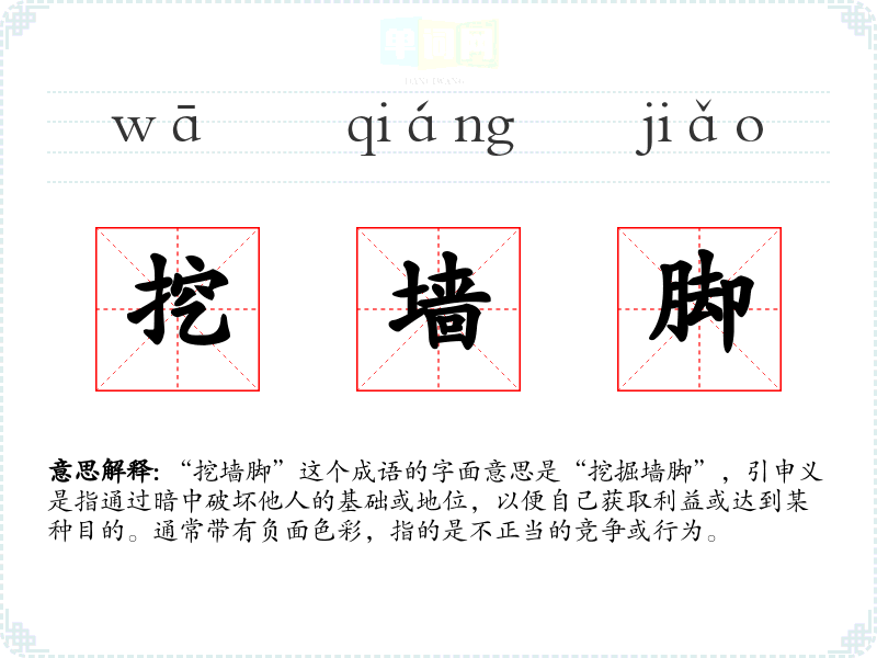 “挖墙脚”这个成语的字面意思是“挖掘墙脚”,引申义是指通过暗中破坏他人的基础或地位,以便自己获取利益或达到某种目的。通常带有负面色彩,指的是不正当的竞争或行为。