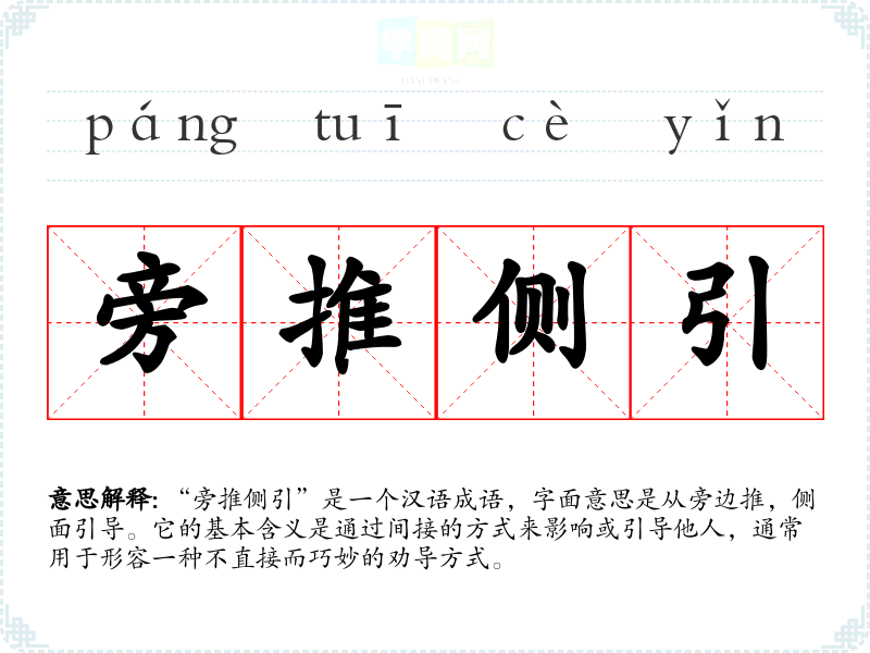 “旁推侧引”是一个汉语成语,字面意思是从旁边推,侧面引导。它的基本含义是通过间接的方式来影响或引导他人,通常用于形容一种不直接而巧妙的劝导方式。