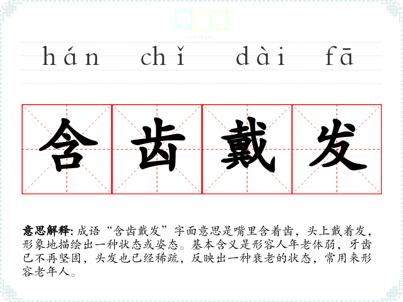 成语“含齿戴发”字面意思是嘴里含着齿,头上戴着发,形象地描绘出一种状态或姿态。基本含义是形容人年老体弱,牙齿已不再坚固,头发也已经稀疏,反映出一种衰老的状态,常用来形容老年人。