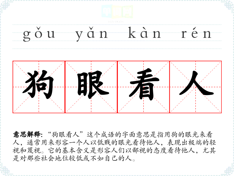 “狗眼看人”这个成语的字面意思是指用狗的眼光来看人,通常用来形容一个人以低贱的眼光看待他人,表现出极端的轻视和蔑视。它的基本含义是形容人们以鄙视的态度看待他人,尤其是对那些社会地位较低或不如自己的人。