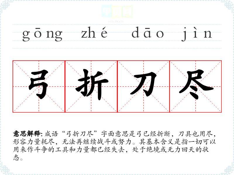 成语“弓折刀尽”字面意思是弓已经折断,刀具也用尽,形容力量耗尽,无法再继续战斗或努力。其基本含义是指一切可以用来作斗争的工具和力量都已经失去,处于绝境或无力回天的状态。