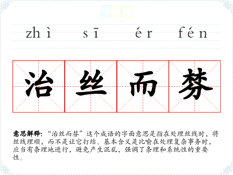 “治丝而棼”这个成语的字面意思是指在处理丝线时,将丝线理顺,而不是让它打结。基本含义是比喻在处理复杂事务时,应当有条理地进行,避免产生混乱,强调了条理和系统性的重要性。