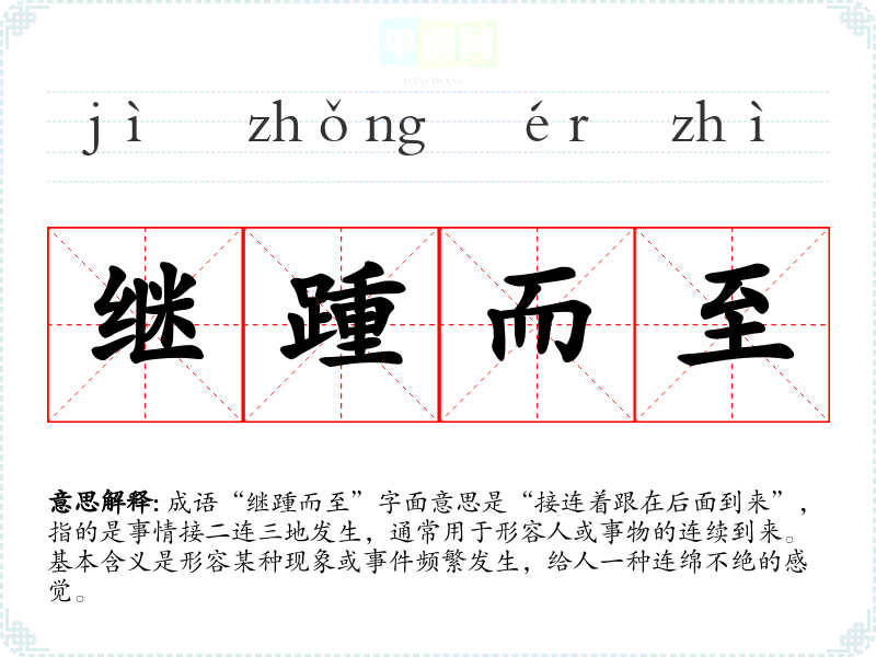 成语“继踵而至”字面意思是“接连着跟在后面到来”,指的是事情接二连三地发生,通常用于形容人或事物的连续到来。基本含义是形容某种现象或**频繁发生,给人一种连绵不绝的感觉。