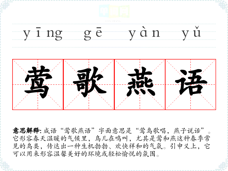 成语“莺歌燕语”字面意思是“莺鸟歌唱,燕子说话”。它形容春天温暖的气候里,鸟儿在鸣叫,尤其是莺和燕这种春季常见的鸟类,传达出一种生机勃勃、欢快祥和的气氛。引申义上,它可以用来形容温馨美好的环境或轻松愉悦的氛围。