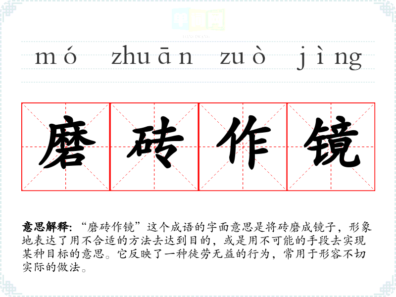 “磨砖作镜”这个成语的字面意思是将砖磨成镜子,形象地表达了用不合适的方法去达到目的,或是用不可能的手段去实现某种目标的意思。它反映了一种徒劳无益的行为,常用于形容不切实际的做法。
