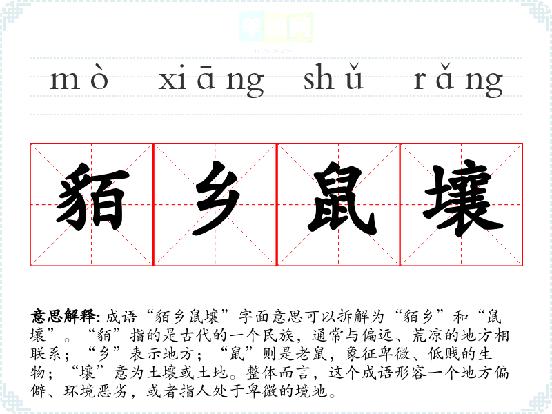 成语“貊乡鼠壤”字面意思可以拆解为“貊乡”和“鼠壤”。“貊”指的是古代的一个民族,通常与偏远、荒凉的地方相联系;“乡”表示地方;“鼠”则是老鼠,象征卑微、低贱的生物;“壤”意为土壤或土地。整体而言,这个成语形容一个地方偏僻、环境恶劣,或者指人处于卑微的境地。