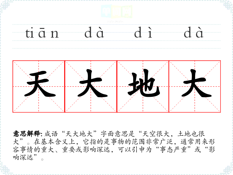 成语“天大地大”字面意思是“天空很大,土地也很大”。在基本含义上,它指的是事物的范围非常广泛,通常用来形容事情的重大、重要或影响深远,可以引申为“事态严重”或“影响深远”。