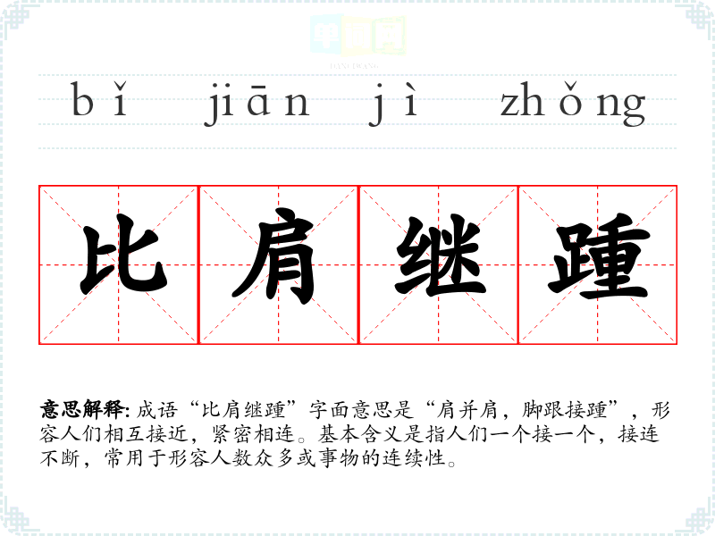 成语“比肩继踵”字面意思是“肩并肩,脚跟接踵”,形容人们相互接近,紧密相连。基本含义是指人们一个接一个,接连不断,常用于形容人数众多或事物的连续性。