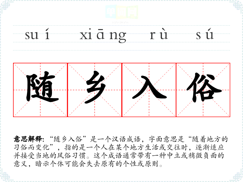 “随乡入俗”是一个汉语成语,字面意思是“随着地方的俗而变化”,指的是一个人在某个地方生活或交往时,逐渐适应并接受当地的风俗惯。这个成语通常带有一种中立或稍微负面的意义,暗示个体可能会失去原有的个性或原则。