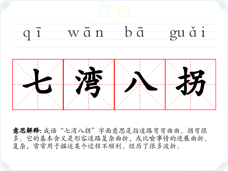 成语“七湾八拐”字面意思是指道路弯弯曲曲、拐弯很多。它的基本含义是形容道路复杂曲折,或比喻事情的进展曲折、复杂,常常用于描述某个过程不顺利、经历了很多波折。