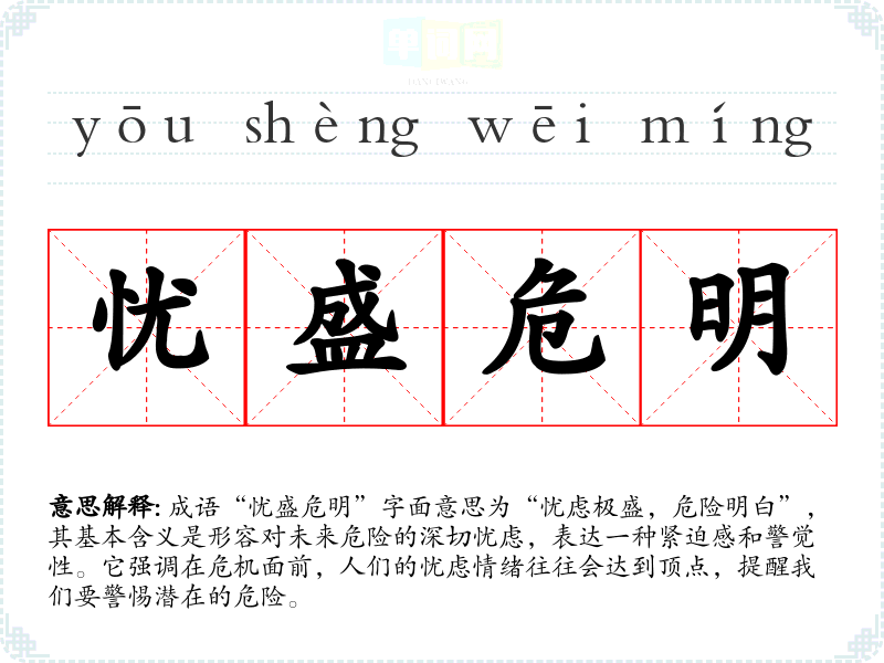 成语“忧盛危明”字面意思为“忧虑极盛,危险明白”,其基本含义是形容对未来危险的深切忧虑,表达一种紧迫感和警觉性。它强调在危机面前,人们的忧虑情绪往往会达到顶点,提醒我们要警惕潜在的危险。