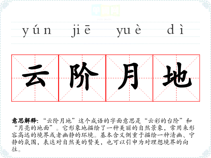 在文学作品中,“云阶月地”常用于形容夜晚美丽的自然景观,或者用作对宁静生活的赞美。在日常对话中,可以用来表达对某种理想状态的向往,比如在谈论旅游时,可以描述某个地方的自然美。在演讲中,这个成语可以用来引入对美好未来的展望,激励听众追求高尚的理想。