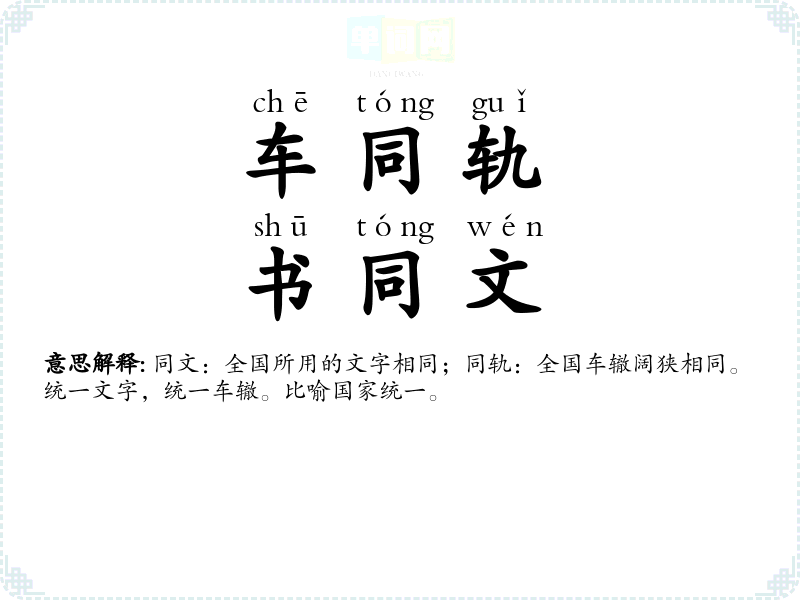 | 车同轨,书同文 | 同文:全国所用的文字相同;同轨:全国车辙阔狭相同。统一文字,统一车辙。比喻国家统一。 |