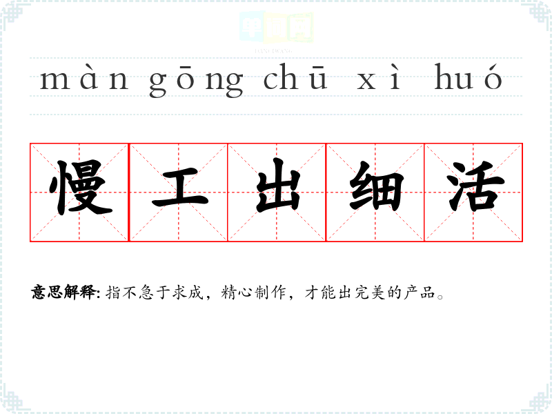 | 慢工出细活 | 指不急于求成,精心制作,才能出完美的产品。 |