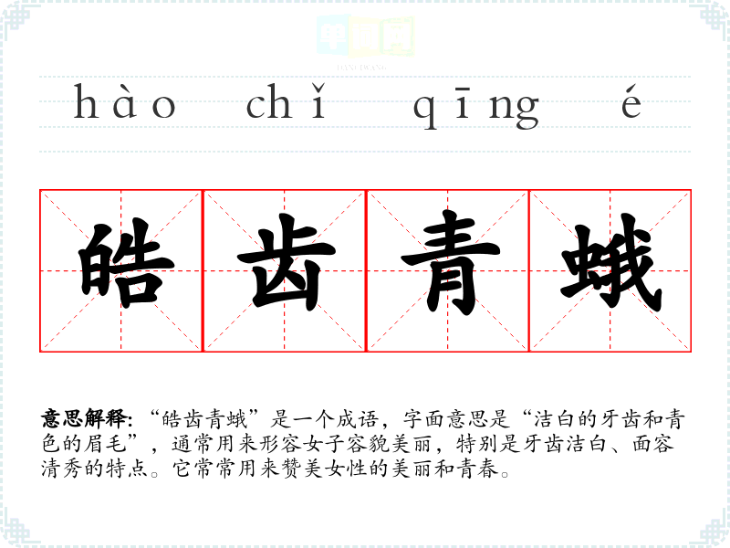 “皓齿青蛾”是一个成语,字面意思是“洁白的牙齿和青色的眉毛”,通常用来形容女子容貌美丽,特别是牙齿洁白、面容清秀的特点。它常常用来赞美女性的美丽和青春。