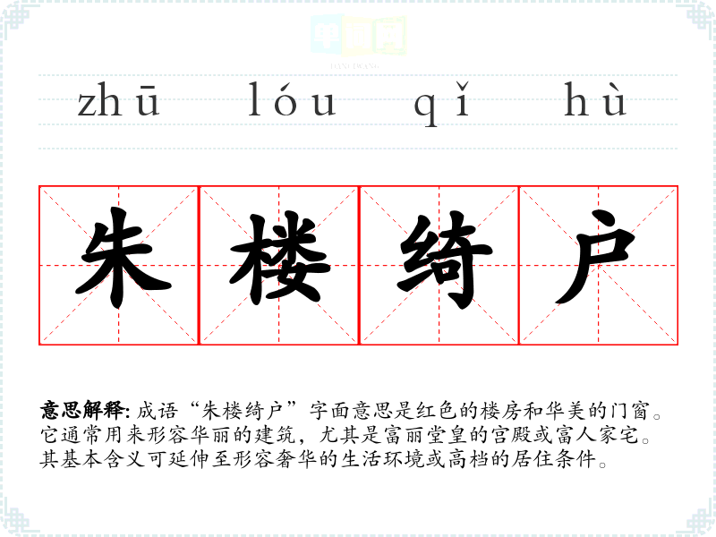 成语“朱楼绮户”字面意思是红色的楼房和华美的门窗。它通常用来形容华丽的建筑,尤其是富丽堂皇的宫殿或富人家宅。其基本含义可延伸至形容奢华的生活环境或高档的居住条件。