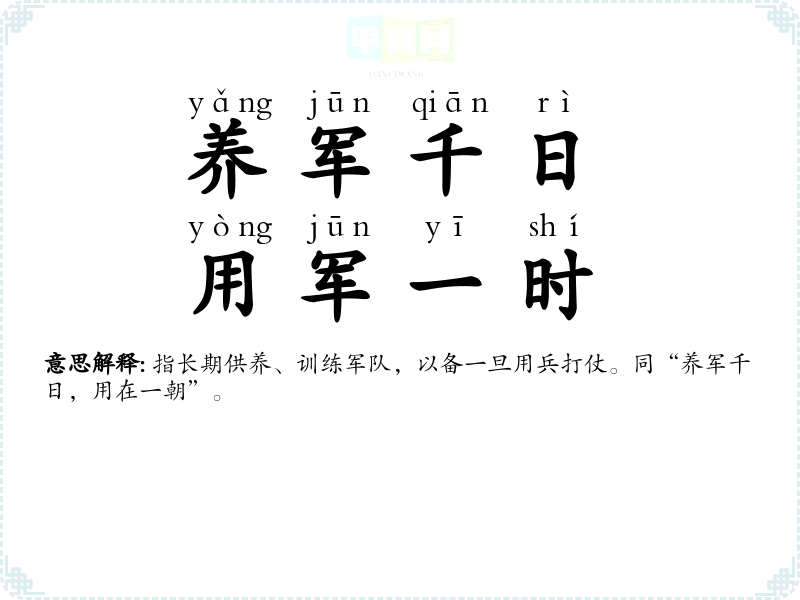 | 养兵千日,用在一时 | 养兵:指供养训练士兵;千日:指长时间。平时供养、训练军队,以便到关键时用兵打仗 |