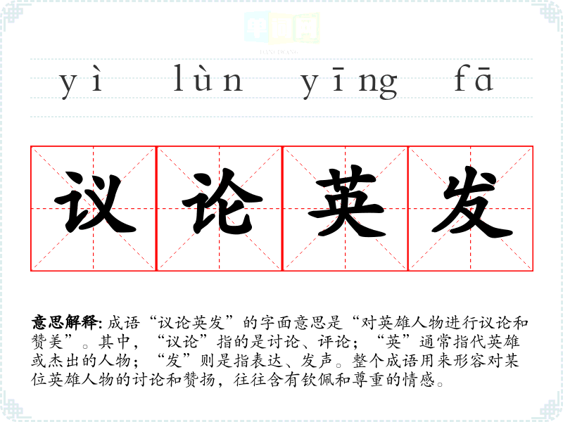 成语“议论英发”的字面意思是“对英雄人物进行议论和赞美”。其中,“议论”指的是讨论、评论;“英”通常指代英雄或杰出的人物;“发”则是指表达、发声。整个成语用来形容对某位英雄人物的讨论和赞扬,往往含有钦佩和尊重的情感。