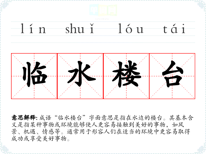 成语“临水楼台”字面意思是指在水边的楼台。其基本含义是指某种事物或环境能够使人更容易接触到美好的事物,如风景、机遇、情感等。通常用于形容人们在适当的环境中更容易取得成功或享受美好事物。