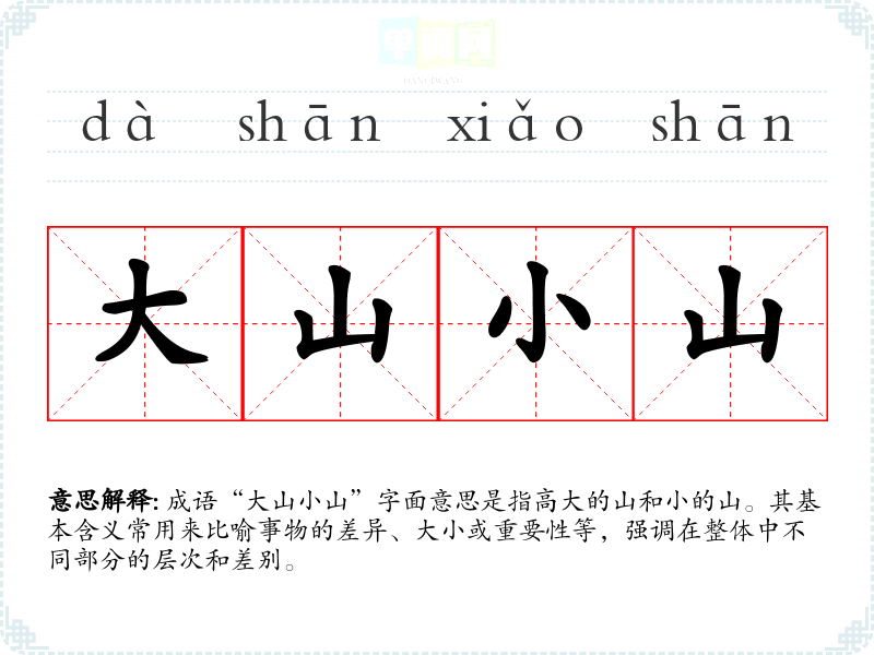成语“大山小山”字面意思是指高大的山和小的山。其基本含义常用来比喻事物的差异、大小或重要性等,强调在整体中不同部分的层次和差别。