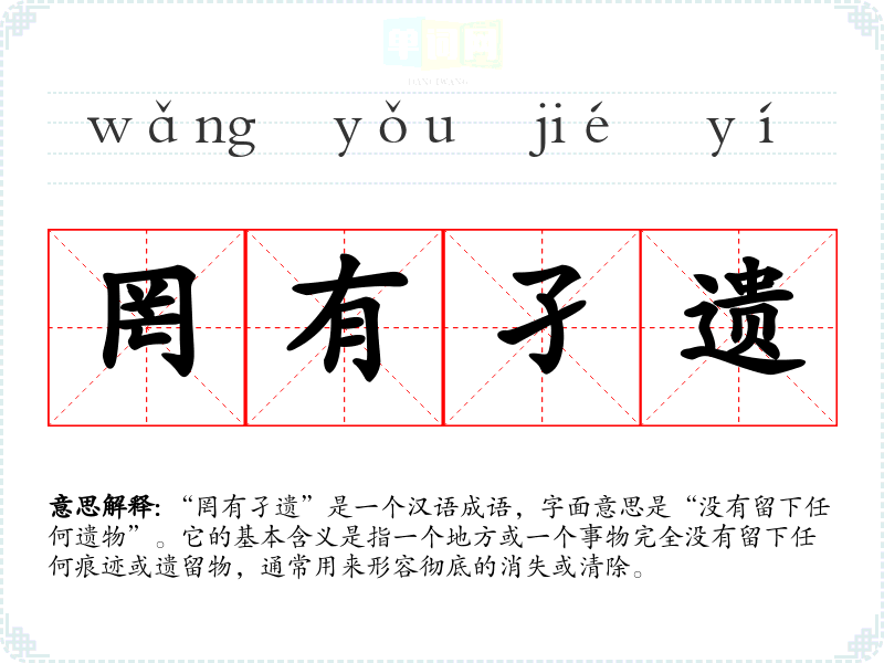 “罔有孑遗”是一个汉语成语,字面意思是“没有留下任何遗物”。它的基本含义是指一个地方或一个事物完全没有留下任何痕迹或遗留物,通常用来形容彻底的消失或清除。