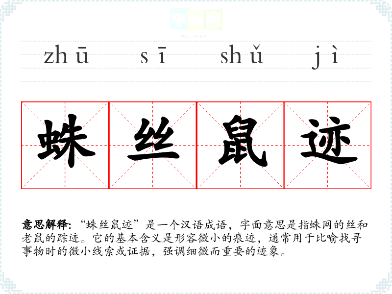 | 蛛丝鼠迹 | 蜘蛛的丝和老鼠留下的痕迹。比喻事情所留下的隐约可寻的痕迹和线索。 |