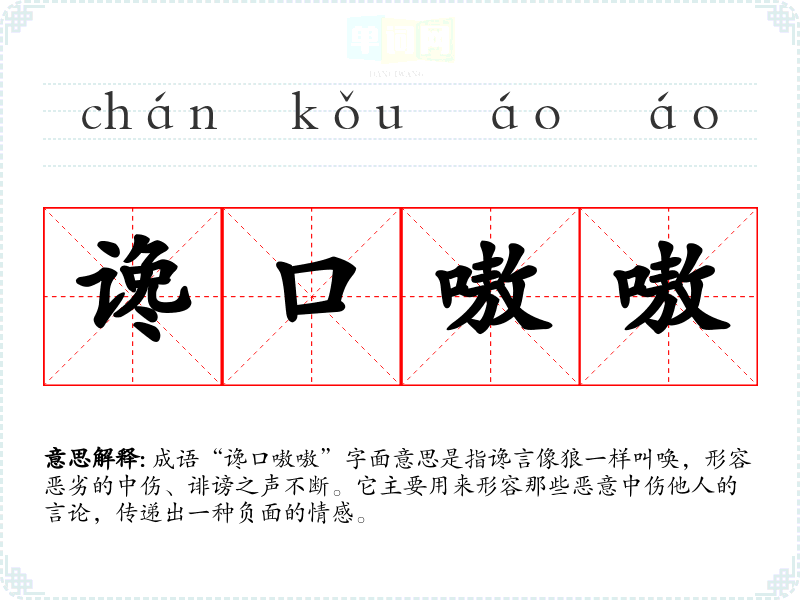 成语“谗口嗷嗷”字面意思是指谗言像狼一样叫唤,形容恶劣的中伤、诽谤之声不断。它主要用来形容那些恶意中伤他人的言论,传递出一种负面的情感。
