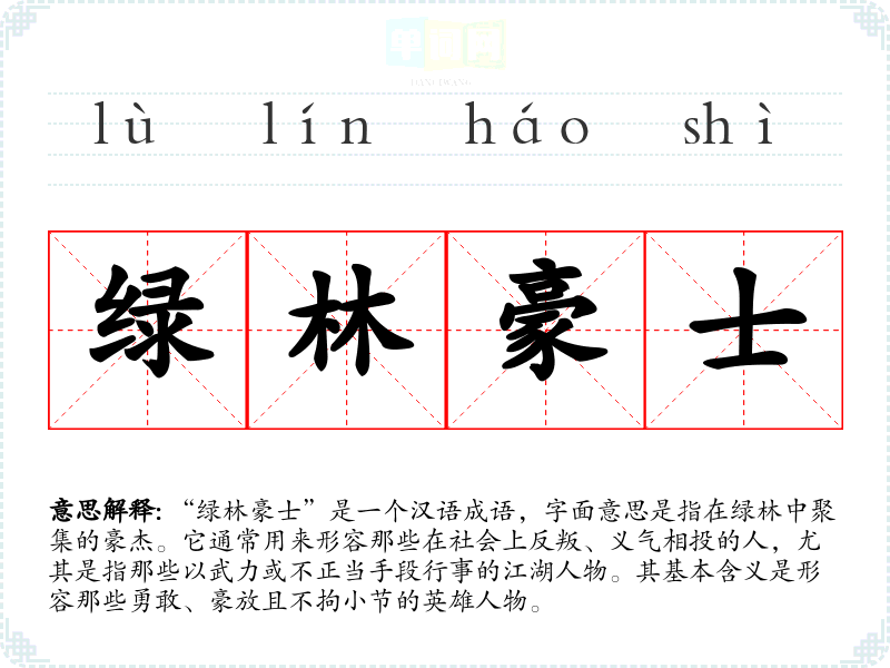 “绿林豪士”是一个汉语成语,字面意思是指在绿林中聚集的豪杰。它通常用来形容那些在社会上反叛、义气相投的人,尤其是指那些以武力或不正当手段行事的江湖人物。其基本含义是形容那些勇敢、豪放且不拘小节的英雄人物。