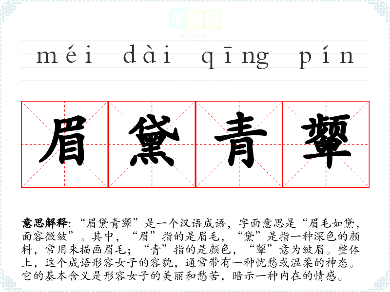 | 眉黛青颦 | 黛:青黑色的颜料,古代女子用来画眉;青颦:古人用青黛染眉,故称青颦。形容女子容貌美丽。 |