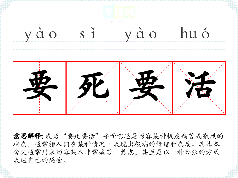 成语“要死要活”字面意思是形容某种极度痛苦或激烈的状态,通常指人们在某种情况下表现出极端的情绪和态度。其基本含义通常用来形容某人非常痛苦、焦虑,甚至是以一种夸张的方式表达自己的感受。