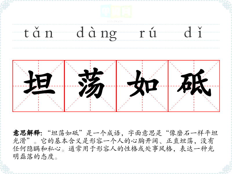 “坦荡如砥”是一个成语,字面意思是“像磨石一样平坦光滑”。它的基本含义是形容一个人的心胸开阔、正直坦荡,没有任何隐瞒和私心。通常用于形容人的性格或处事风格,表达一种光明磊落的态度。